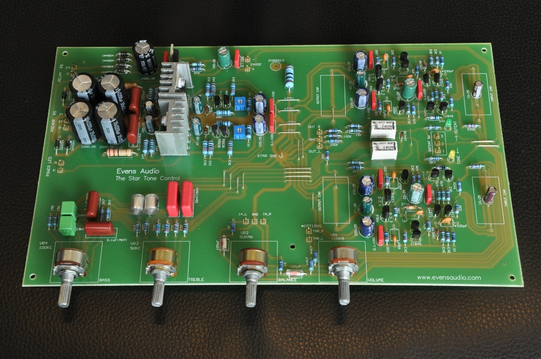 The Star Tone Control เป็นโทนคอนโทรลที่ออกแบบมาสำหรับนัก DIY เครื่องเสียง ที่โหยหาไลน์แอมป์หรือโทนคอนโทรลสำหรับใช้ฟังเพลง ความพิเศษของ The Star Tone Control ตัวนี้คือ เทคนิคการออกแบบ PCB ที่ออกแบบโครงสร้างกราวด์แบบ Star แท้ๆ เพื่อให้วงจรมีระดับสัญญาณรบกวนต่ำสุด ช่วยให้เปิดเผยทุกรายละเอียดฮาร์โมนิคของเสียงดนตรี ภาคจ่ายไฟของ The Star Tone Control ออกแบบเป็นวงจรเร็กกูเลเตอร์ที่สามารถปรับแรงดันเอาต์พุตได้ และวงจรใช้แรงดันสูงถึง +/-22V ซึ่งทำให้วงจรมีระดับเฮดรูมที่เหลือเฟือ การที่สามารถปรับแรงดันแหล่งจ่ายไฟได้ ก็เหมาะอย่างยิ่งสำหรับนัก DIY ที่จะเค้นหาน้ำเสียงที่ถูกใจจากการปรับเปลี่ยนแรงดันแหล่งจ่ายไฟ ในฟังก์ชั่น DEFAETเราเลือกที่จะใช้รีเลย์ควบคุมการทำงานแทนการใช้สวิตซ์ เพื่อลดการเดินสายสัญญาณในวงจร ส่วนของ Negative Feedback ซึ่งการเดินสายออกยาวๆออกไปที่สวิตซ์มีข้อเสียเรื่องเกิดสัญญาณรบกวนได้ง่าย นอกจากนั้นยังแยกแหล่งจ่ายไฟสำหรับขับคอยล์รีเลย์ไว้ไม่ให้ปนกับแหล่งจ่ายไฟของปรีแอมป์ การควบคุมฟังก์ชั่น DEFEAT จึงใช้งานง่ายด้วยสวิตซ์เพียง 3 ขา พร้อมมี LED แสดงผล อุปกรณ์ที่ใช้ใน The Star Tone Control ถูกคัดสรรค์มาเพื่อให้น้ำเสียงที่ลงตัวและเรื่องของราคาที่เหมาะสมสำหรับทุกท่าน แต่เพื่อเป็นการเอาใจนัก DIY เราได้ออกแบบ ออปชั่นเสริมสำหรับท่านที่อยากทดลองเปลี่ยน C Input และ Coutput รวมถึงการเปลี่ยน Potentiometer คุณภาพสูงเล่นได้ด้วย