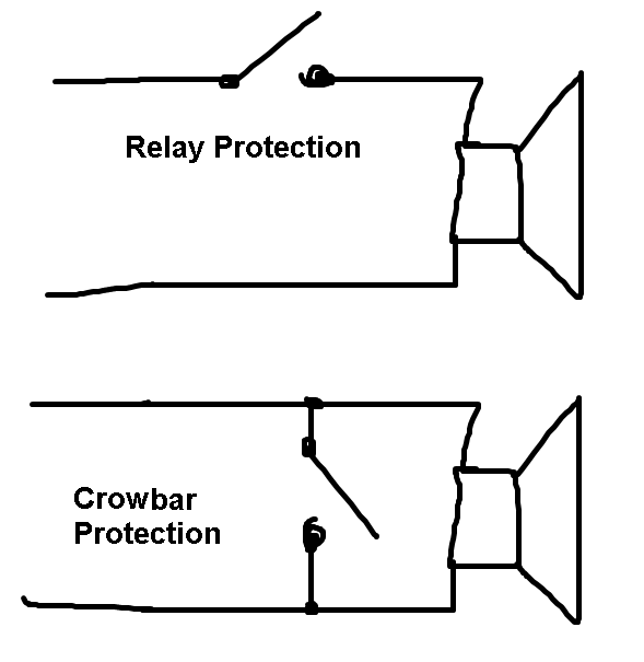 ข้อแตกต่างระหว่าง Relay Protection กับ Crowbar Protection แม้เราจะเห็นวงจรป้องกันลำโพงแบบ Crowbar Protection ในเพาเวอร์แอมป์วัตต์สูงระดับโลกมาแล้วแต่มันก็มีข้อควรระวังในการใช้งานสำหรับนัก DIY ที่ควรทราบ