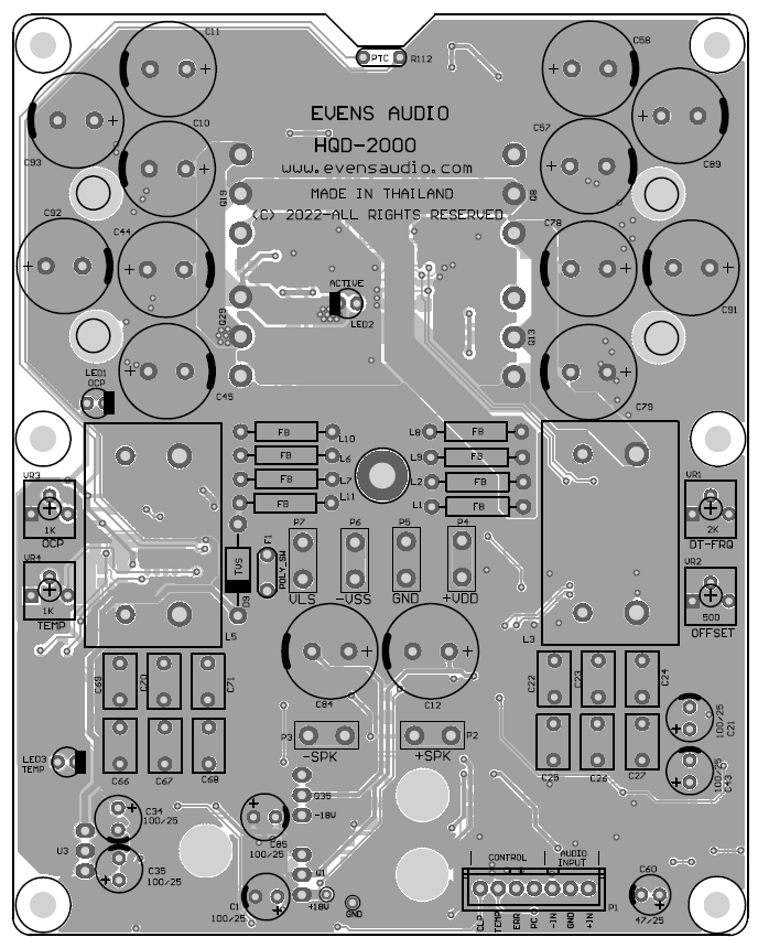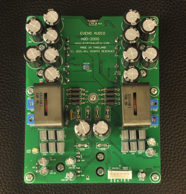 HQD-2000 เพาเวอร์แอมป์ที่ ป้อนกลับแบบ Global Feedback ซึ่งเป็นเพาเวอร์แอมป์ Class D ที่ให้น้ำเสียงเป็นธรรมชาติมาก เป็นที่ยอมรับของเหล่านัก DIY และ Audiophile มาโดยตลอด Evens Audio นำเทคนิค Global Feedback มาออกแบบวงจรเพื่อให้ได้กำลังเอาต์พุตสูงๆ โดยที่เพาเวอร์แอมป์ไม่ต้องใช้ไฟเลี้ยงวงจรสูงเกิน +/-100Vdc โดยใช้เทคนิคจัดเอาต์พุตแบบ Full-Bridge นั้นให้ประสิทธิภาพสูงมีกำลังสูญเสียในรูปแบบความร้อนต่ำ HQD-2000 ถูกออกแบบให้มีวงจร Mute หรือ PC (Power Control ) สำหรับเชื่อมกับสวิตชิ่งเพาเวอร์ซัพพลาย PSX-Series ทำให้การเปิด-ปิดเครื่องได้อย่างนิ่มนวลไร้เสียงรบกวน มีระบบป้องกัน Over Load ป้องกันการต่อลำโพงมากเกินไปหรือมีการลัดวงจร มีระบบป้องกันอุณหภูมิสูงเกิน