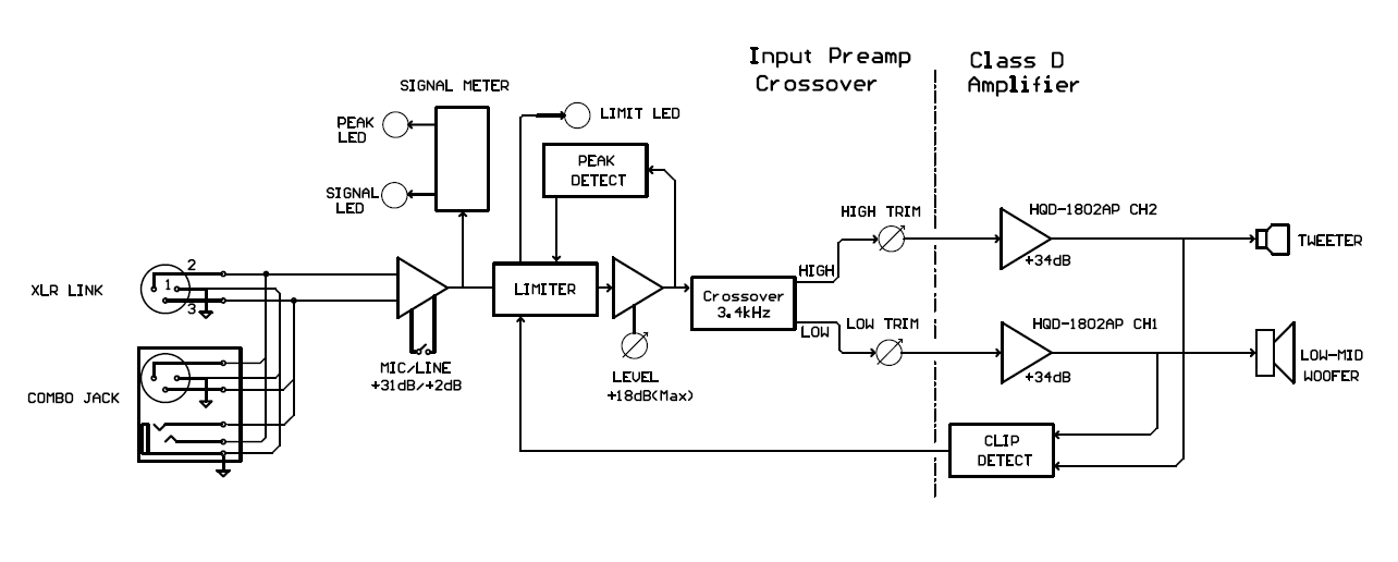 Plate Amp รุ่น HQD-1802AP 2-Way ออกแบบมาสำหรับ Active Speaker ในระบบ 2 ทาง อินพุตแบบ XLR Combo โดยสามารถเลือกแหล่งความแรงสัญญาณได้ 2 ระดับ คือ LINE และ MIC มี LED แสดงระดับสัญญาณเสียงอินพุตปกติ และค่าพีคของสัญญาณ มีวงจร Limiter ป้องกันการ Clip และ สัญญาณที่แรงเกินไป Active Crossover แบบ Linear Phase จุดตัดความถี่ 3.4kHz ความชัน -24db/Oct และสามารถกำหนดจุดตัดความถี่ตามสั่ง (Custom) ได้