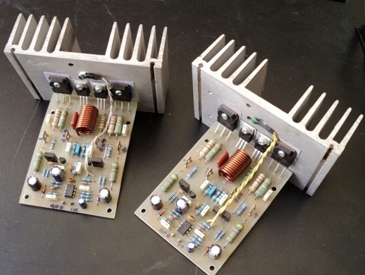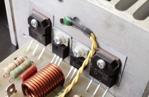 เมื่อได้ PCB มาแล้วก็ถึงเวลาลงอุปกรณ์แสดงในรูปที่7 การลงอุปกรณ์ก็เหมือนกับโครงงานอื่นๆเลือกลงอุปกรณ์ชนิดตั้งเตี้ยๆก่อนเช่น จั๊มพ์เปอร์ ตัวต้านทาน คอนเน็เตอร์ ตาไก่ ทรานซิสเตอร์ขนาดเล็ก ตัวเก็บประจุ และสุดท้ายคือติดตั้งทรานซิสเตอร์ไดร์วและเพาเวอร์เอาต์พุต
