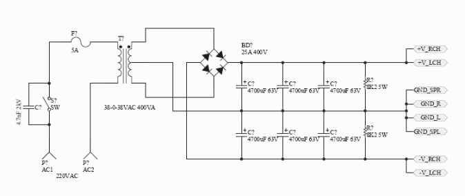 วงจรภาคจ่ายเบื้องต้นไฟสำหรับ RX-100 ในแบบสตอริโอแสดงดังรูปที่5 โดยออกแบบไว้เพื่อเป็นแนวทางคร่าวๆนะครับเพราะเชื่อว่าหลายๆท่านอาจจะมีหม้อ แปลงหรือตัวเก็บประจุฟิลเตอร์อยู่ที่บ้านแล้วก็สามารถนำมาใช้ได้เช่นกันที่จริงแล้ววงจร RX-100 สามารถรองรับย่านแรงดันไฟเลี้ยงได้สูงถึง +/-90V แต่สำหรับโครงงานนี้หากใช้ไฟเลี้ยงสูงมากเกินไปก็อาจผิดวัตถุประสงค์ของโครงงานดังนั้นแนะนำให้ใช้แรงดันช่วง +/-45V ถึง +/-60V จะช่วยประหยัดขนาดฮีตซิงค์ และอุณหภูมิของเอาต์พุตทรานซิสเตอร์จะได้ไม่สูงจนเกินไป