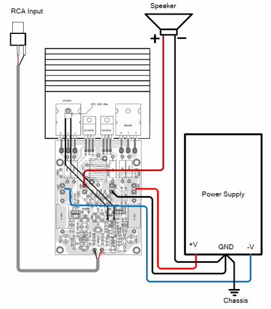 เริ่มจาสัญญาณเสียงจากอินพุตจะถูกส่งผ่าน C1 ค่า 10uF และ R1 ค่า 470 โอห์ม ป้องกันไม่ให้แรงดัน DC เข้ามาในระบบและเป็นตัวกำหนดแบนวิธด้านความถี่ต่ำที่เข้ามาในวงจรด้วย ส่วน R3 เป็นส่วนที่กำหนดอิมพีแดนซ์ทางอินพุต C7 ค่า 470pF กำหนดแบนวิธด้านความถี่สูงป้องกันสัญญาณรบกวนความถี่สูง ซึ่งเป็นวงจรพื้นฐานของภาคอินพุตของเพาเวอร์แอมป์ทั่วไป สัญญาณเสียงจะถูกป้อนให้กับขา Non-Inverting ของ ออป-แอมป์ เบอร์ NE5534 โดยมี C6 ค่า 100pF เป็นตัวป้อนกลับความถี่สูงไม่ให้ ออป-แอมป์ขยายสัญญาณความถี่สูงเกินไปป้องกันการเกิดออสซิลเลท สัญญาณที่ออกจากออป-แอมป์ ผ่าน R11 ค่า 100 โอห์มจะถูกส่งให้กับจรจรขยายสัญญาณภาคที่ 2 ซึ่งมี D3,D4,R7,R8,R12 และRT1 เป็นวงจรไบอัสและชดเชยอุณหภูมิโดยต้องนำ RT1 ซึ่งเป็น NTC ตัวต้านทานเปลี่ยนค่าตามอุณหภูมิติดตั้งไว้ฮีตซิงค์เดียวกันกับเพาเวอร์ ทรานซิสเตอร์ในส่วนของวงจรขยายสัญญาณในภาคที่ 2 นี้จะเป็นคอมม่อนอีมิเตอร์ แยกการทำงานออกเป็น 2 เฟสโดยเฟสสัญญาณ บวก (+) จะถูกทรานซิสเตอร์ Q1และQ2 เป็นตัวขยายสัญญาณ โดย Q1 ทำหน้าที่เป็นทรานซิสเตอร์คาสโคดคอยรักษาแรงดันให้ Vce ของ Q2 คงที่อยู่ที่ประมาณ 15V ส่วนสัญญาณในเฟสลบ(-) จะถูกขยายโดย Q3 และ Q4 กระแสคงที่ทีไหลในภาคขยายที่2นี้จะถูกตั้งไว้ประมาณ 5mA สัญญาณจะถูกส่งออกทางขา คอลเล็กเตอร์ซึ่งต่ออยู่กับตัวต้านทาน R15 ค่า 220 โอห์มมุมเฟสของสัญญาณที่ออกจากวงจรภาคนี้จะกลับไปจากเดิม 180 องศา ดังนั้นในภาคไดรเวอร์และเพาเวอร์เอาต์พุตจึงต้องเป็นคอมม่อนอีมิเตอร์สัญญาณ จึงจะลับมาเป็นมุมเฟสที่ถูกต้องตามเดิม ในภาคไดรเวอร์และเอาต์พุตประกอบด้วย Q5 และ Q8 โดยจัดวงจรในแบบคลาส AB วงจรนี้ภาคไดรเวอร์ Q5และQ6 จะถูกตั้งกระแสสงบไว้ค่อนข้างสูง ซึ่งเป็นผลดีทำให้ความเพี้ยนรอยต่อลดลง แต่ทรานซิสเตอร์จะมีอุณหภูมิค่อนข้างสูงจึงควรติดทรานซิสเตอร์ไดรเวอร์ไว้ ที่ฮีตซิงค์หลัก ในภาคเอาต์พุตจะมีวงจรป้อนกลับความถี่สูงเพื่อป้องกันการเกิดออสซิลเลทโดย C18 และ R19 ซึ่งทำหน้าที่ป้อนกลับเฉพาะส่วนของภาคเอาต์พุตเท่านั้น ส่วนการป้อนกลับแบบลบเพื่อกำหนดอัตราขยายและความถี่โดยรวมของวงจรทั้งหมดคือ R4,R2,C2,C3 และ C8 โดยวงจรนี้จะถูกตั้งอัตราขยายโดย R4/R2 เท่ากับ 42 เท่า หรือ ประมาณ 32dB
