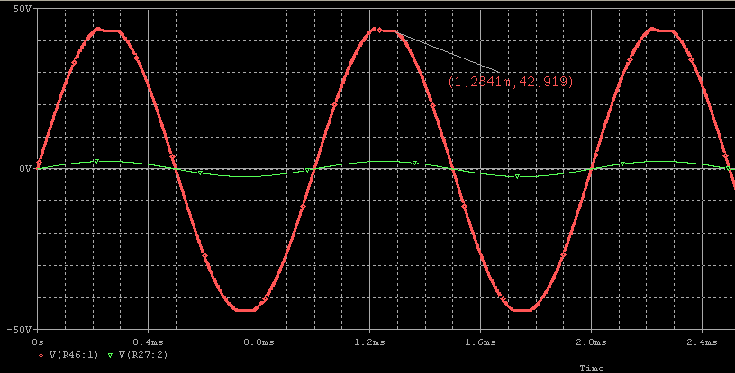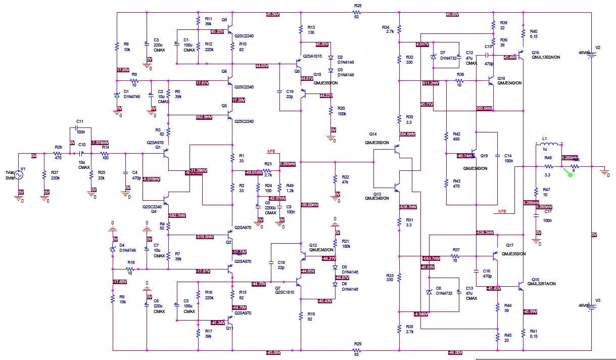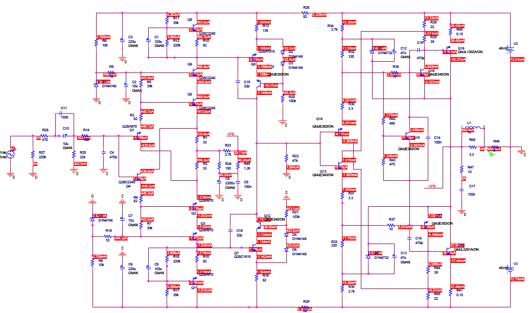 *จากการซิมมูเลชั่น ปรับค่า R13 ได้ค่า 136 โอห์มได้แรงดัน Output Offset เพียง 5.2mV ปรับค่ากระแสสงบด้วย R42 จนได้กระแสสงบประมาณ 30mA