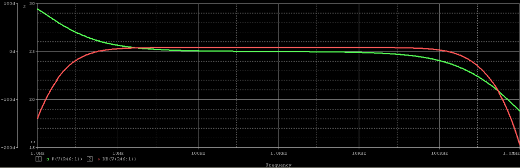 การตอบสนองทางเฟสแต่ละความถี่ แสดงเป็นเส้นสีเขียวซึ่งก็ทำได้ดีมากเช่นกัน ที่ความถี่ต่ำๆเฟสจะมีการนำหน้าเล็กน้อย แต่โดยรวมแล้วในย่าน 20-20kHz เฟสของสัญญาณมีการเลื่อนที่น้อยมาก จากผลการตอบสนองทางเฟสเมื่อนำมาวิเคาราะห์ทำให้รู้ว่า โดยปกติของวงจรขยายสัญญาณทุกชนิดหากเฟสของสัญญาณ ณ. ความถี่ใดมีกาเลื่อนเฟสครบ 360 องศา และ Gain มีค่า>1เท่า จะเกิดการออสซิลเลทที่ความถี่นั้น ดังนันจากกราฟนี้ที่ความถี่สูงๆ Gain ลดลงมากแล้วแต่การเลื่อนเฟสยังไม่ถึง 200 องศานั่นหมายถึงโอกาสที่จะเกิดออสซิลเลทในวงจรนี้เป็นไปได้น้อยหรือไม่มีเลยครับ