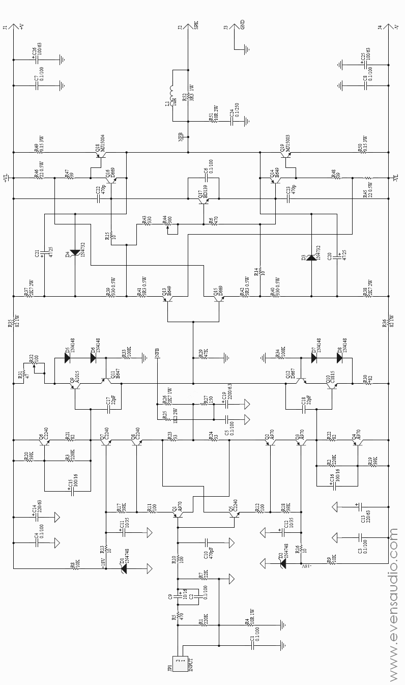จากรูปที่2 สัญญาณเสียงจากแหล่งจ่ายสัญญาณ หรือปรีแอมป์จะถูกส่งผ่าน R5,C9,C2 และ R10 โดยมี R1 และ R7 ทำหน้าที่เป็นไบอัสกระแสของภาคขยายภาคแรก และช่วยกำหนดอิมพีแดนซ์ทางด้านอินพุตของวงจรขยาย C10 ทำหน้าที่กรองสัญญาณความถี่สูงเกินออกไปจากระบบ C1 และ R4 ทำหน้าที่เป็น Ground break แยก Signal Ground ออกจาก Power Ground ป้องกันการเกิดกราวด์ลูป สัญญาณเสียงเข้ามายังขา B ของ Q1 และ Q5 ทำหน้าที่เป็น Input Buffer ที่มีอิมพีแดนซ์สูงและมีอัตราขยายเท่ากับ1 สัญญาณแบบไม่กลับเฟสจะส่งออกทางขาอีมิเตอร์ผ่าน R11 และ R12 ไปยังขา B ของ Q8 และ Q2 โดยมี R17และR18 ทำหน้าที่ไบอัส ในวงจรส่วนนี้มี Q7และQ3 ทำงานร่วมด้วยเป็นลักษณะของวงจรขยายสัญญาณแบบคาสโคด มีแรงดันอ้างอิงที่ขา B ของ Q7,Q3 ประมาณ 18V ซึ่งเกิดจาก R8,R9,R13,R16,D1และD2 ต่อเป็นวงจรเร็กกูเลเตอร์แบบขนาน และมี C11และC12 กรองริปเปิ้ลให้แรงดันมีความเรียบยิ่งขึ้น ทางด้านเอาต์พุตแบบกลับเฟสของวงจรขยายบัฟเฟอร์ภาคแรก ถูกส่งออกทางขา C ของ Q7 และ Q3 ไปยังภาคขยายแรงดันโดยมีวงจรแหล่งจ่ากระแสคงที่ประมาณ 1mA ทำหน้าที่เป็นแอกทีฟโหลด ประกอบไปด้วย Q6,R3,R20,R21และ C15 ทำงานในฝั่งบวก Q4,R2,R19,R22 และ C16 ทำงานในฝั่งลบ ภาคขายแรงดันซึ่งประกอบด้วย Q9,Q10,Q11 และ Q12 เป็นวงจรขยายแบบคาสโคดเช่นกัน โดยมี D5,D6,D7,D8,R33 และ R34 จัดเป็นเป็นวงจรไบอัส R32 ทำหน้าที่ปรับบาลานซ์กระแสของวงจรทั้งสองซีกเพื่อให้จุดเอาต์พุตมีค่าเป็น 0V C17 และ C18 ทำหน้าที่ลดการตอบสนองความถี่สูงของภาคขายแรงดันเพื่อป้องกันการเกิดออสซิลเลท สัญญาณจะถูกส่งออกมาทางขา C ของ Q11,Q12 และมี R29 เป็นโหลด สัญญาณถูกส่งต่อไปยังภาคขยายกำลังโดยมี Q13 และ Q15 ต่อเป็น Input Buffer เพื่อให้อินพุตมีอิมพีแดนซ์สูงR37,R38,R39,R40,D3,D4,C20 และ C21 ทำหน้าที่เป็นวงจรไบอัสให้ภาคขยายกำลัง สัญญาณจะถูกส่งผ่าน R41 และ R42 ไปยังภาคขายกำลัง ประกอบไปด้วย Q14,Q16,Q18 และ Q19 จัดเป็นวงจรแบบ Compound เพื่อให้มีอัตราขายที่สูงขึ้น โดยมี Q17,R6,R43,R44 และ C6 เป็นวงจรควบคุมกระแสไบอัสและชดเชยอุณหภูมิ สัญญาณที่ถูกขยาย ออกทางขา C ของ Q18 และ Q19 จะถูกป้อนกลับด้วยเน็ทเวิร์ค R25,R26,R27,C5 และ C19 มายังเอาต์พุตของบัฟเฟอร์ที่อัตราขายเท่ากับ1ทำหน้าที่เสมือนเป็น Error Amp โดยคิดอัตราขยายจาก R26/R27 มีค่าประมาณ 18 เท่า หรือ ประมาณ 25dB L1,R51,R52 และ C24 เป็นวงจร Zobel Network เพื่อเสถียรภาพของวงจร
