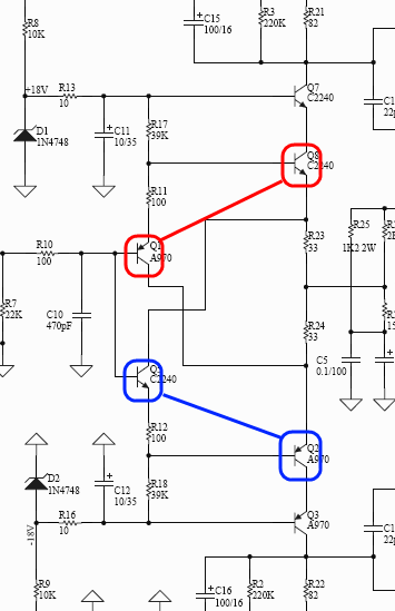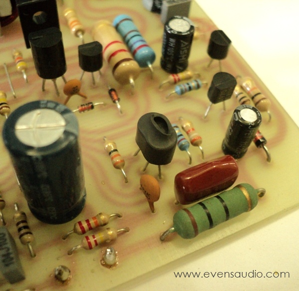ในวงจร C320 เดิมใช้เอาต์พุตทรานซิสเตอร์เบอร์ 2SC5200 และ 2SA1943 แต่ในโครงงานนี้จะเลือกใช้ทรานซิสเตอร์เอาต์พุต เบอร์ MJ15003 และ MJ15004 ซึ่งให้คุณสมบัติที่ดีกว่าหลายด้าน เพียงแต่มีราคาที่สูงกว่าเท่านั้น เพื่อช่วยเสริมเขี้ยวเล็บ และเพิ่มความเป็น Hi-End ให้กับโครงงานนี้จึง เลือกใช้คู่เอาต์พุตทรานซิสเตอร์ดังกล่าว ในส่วนของทรานซิสเตอร์ขยายสัญญาณขนาดเล็กใช้ตามวงจรเดิม ซึ่งมีคุณสมบัติที่ดีอยู่แล้ว นอกจากนั้นการออกแบบลาย PCB ยังให้ความสำคัญกับรายละเอียดเล็กๆน้อยๆจากรูปที่ 3 ลักษณะของ PCB ในโครงงานนี้จะออกแบบให้เส้นแทรกมีมุมโค้ง การออกแบบให้เส้นแทรกมีลักษณะนี้ได้รับการยอมรับอย่างแพร่หลายในการออกแบบเครื่องเสียงระดับ Hi-End ในส่วนของวงจรที่เกี่ยวข้องกับสัญญาณอนาล็อก