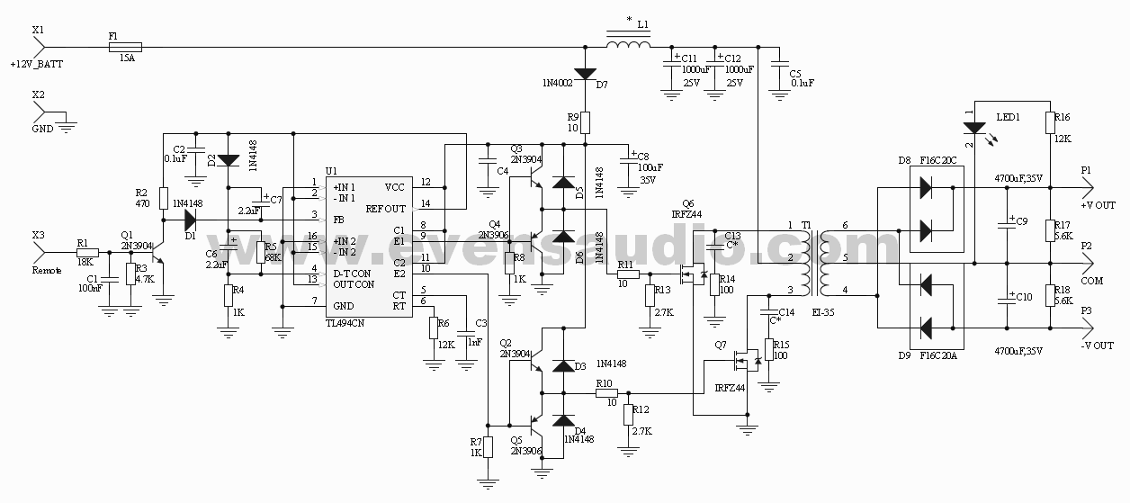 อธิบายแบบคร่าวๆนะครับ U1 เป็นไอซี PWM Control ทำหน้าที่กำเนิดสัญญาณ PWM (Pulse Width Modulation) ขอเรียกสั้นๆว่า พัลซ์ ซึ่งถูกกำหนดความถี่ออสซิลเลเตอร์ภายในโดย R6,C3 จากสูตร fosc=1.1/(RT*CT) วงจรนี้ความถี่สวิตชิ่งจะหาร2จากความถี่ออสซิลเลเตอร์ ตามวงจรความถี่ออสซิลเลเตอร์กำหนดไว้ประมาณ 91.6kHz ดังนั้นความถี่สวิตชิ่งอยู่ที่ประมาณ 45.8kHz ในส่วนของวงจร Remote ประกอบด้วย Q1,R1,R2,R3,C1,D1 และ C7 คือวงจรจะคอยตรวจสอบแรงดัน 12V ที่ขา Remote เพื่อควบคุมการจ่ายพัลซ์เป็นการสั่งเปิด-ปิดเครื่องโดยวิทยุในรถยนต์ D2,C6,R4,R5 เป็นวงจร Soft-Start วงจรจะค่อยๆปรับความกว้างของพัลซ์ทีละนิดขณะเปิดเครื่องครั้งแรก Q2,Q3,Q4,Q5,D3,D4,D5,D6,R7,R8 คือวงจร Gate Drive ช่วยเพิ่มกระแสขับให้มอสเฟ็ต R10,R11 คือ R-Gate และ R12,R13 เป็น Pulldown Resistor มีหน้าที่ช่วยลดอิมพีแดนซ์ของมอสเฟ็ต ช่วยดิสชาร์จความจุภายใน G-S ของมอสเฟ็ต Q6,Q7 เป็นเพาเวอร์มอสเฟ็ตที่ต่อเป็นวงจรสวิตชิ่งคอนเวอร์เตอร์แบบพุชพูล (Push-Pull) C13,C14, R14,R15 เป็นวงจร สนับเบอร์ (Snubber) ช่วยลดสัญญาณรบกวนของวงจรสวิตชิ่ง วงจรควบคุมพัลซ์จะใช้ไฟ 12Vdc จากแบตเตอรี่ผ่านฟิวส์ F1 มาทาง D7,R9 โดยมี C4,C8 ทำหน้าที่เป็น Decoupling *L1,C5,C11,C12 เป็นวงจรกรอง ความถี่ต่ำ ป้องกันสัญญาณรบกวนจากการสวิตซ์มารบกวนระบบภายนอก T1 ทำหน้าที่เป็นหม้อแปลงความถี่สูงปรับแรงดันไฟขึ้นซึ่งเราได้มาจากซัพพลายคอมพิวเตอร์ ซึ่งโครงงานนี้เราจะกลับด้านหม้อแปลง นำเอาขดเดิมที่เคยเป็น Seccondary 12V นำมาจ่ายพัลซ์เข้าไป และขดด้านไฟออกจากเดิมที่เคยเป็น Primary จะกลายเป็นเอาต์พุต นำไปเร็กติไฟร์ด้วย D8,D9 และฟิลเตอร์ด้วย C9,C10 และมี R17,R18 ทำหน้าที่เป็นโหลดดิสชาร์จตัวเก็บประจุทิ้ง R16,LED1 ทำหน้าที่แสดงผลการทำงานของเครื่อง