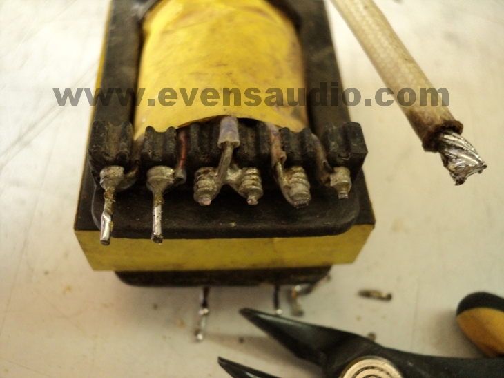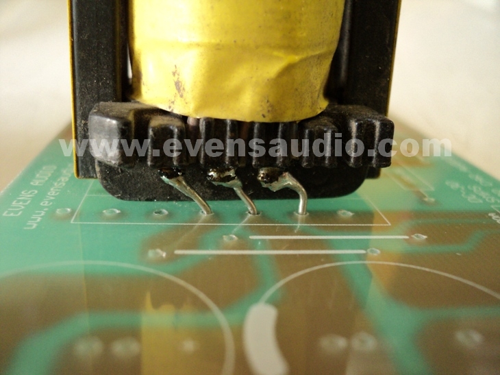 รูปที่7 หากขาหม้อแปลงไม่ตรงกับลาย PCB ให้ตัดขาเดิมออก บัดกรีต่อขาใหม่แล้วดัดขาให้ลงในตำแหน่งที่ถูกต้อง
