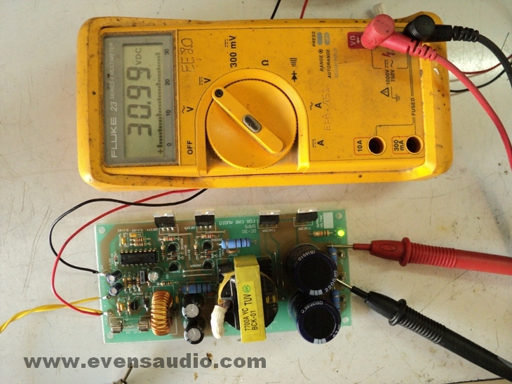 7.เมื่อ LED แสดงผลสว่างขึ้น ใช้มิเตอร์วัดแรงดันด้านเอาต์พุตจะได้ประมาณ +/-30V ถึง +/-35V เป็นอันว่าใช้ได้