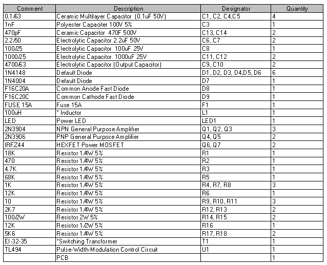 หัวใจหลักของโครงงานนี้เราจะนำหม้อแปลงของสวิตชิ่งคอมพิวเตอร์มาใช้ออกแบบเป็น DC/DC Converter 12 to +/-30V แบบไม่ต้องแกะพันหม้อแปลงใหม่ และไอซีพระเอกของงานคือ TL494/KA7500 ซึ่งก็มีในสวิตขิ่งคอมฯทั่วๆไปอยู่แล้ว ขดลวด Filter * L1 ถอดเอาแกนทอรอยด์มาพันขดลวดใหม่ รวมทั้งฮีตซิงค์ ฯลฯ ส่วนอุปกรณ์อื่นๆที่หาไม่ได้ในสวิตชิ่งที่เสียแล้วยังจำเป็นต้องซื้อหามาเพิ่ม แต่แค่นี้ก็ประหยัดงบไปมากแล้วเพราะหัวใจของโครงงานนี้คือหม้อแปลงเก่านั่นเอง มาดูวงจรกันก่อนครับ