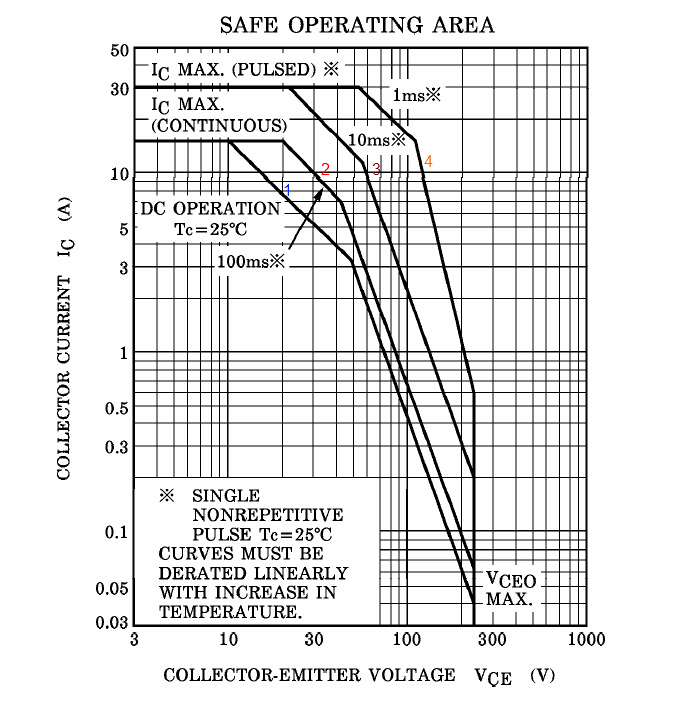 มีคำถามเข้ามาบ่อยเกี่ยวกับการเลือกใช้จำนวนของเอาต์พุตทรานซิสเตอร์ที่เหมาะสม ว่าควรขนานเอาต์พุตจำนวนกี่คู่ดี บทความตอนนี้จะเป็นแนวทางสำหรับนักประกอบเพาเวอร์แอมป์ ที่ต้องการทราบจำนวนคู่เอาต์พุตที่เหมาะสม ในการประกอบเพาเวอร์แอมป์ สิ่งที่ขาดไม่ได้ในการพิจารณาจำนวนเอาต์พุตทรานซิสเตอร์ในเพาเวอร์แอมป์ที่เรากำลังจะสร้าง นั่นก็คือ Datasheet เอาต์พุตทรานซิสเตอร์ที่เราเลือกมาใช้ ตรงนี้สำคัญมาก ข้อมูลใน Datasheet ที่เราจะนำมาพิจารณาครั้งนี้คือ กราฟ Safe Operating Area (SOA) แปลเป็นภาษาไทยว่า กราฟพื้นที่ปลอดภัย เรามาทำความเข้าใจกราฟนี้กันก่อนดีกว่า
