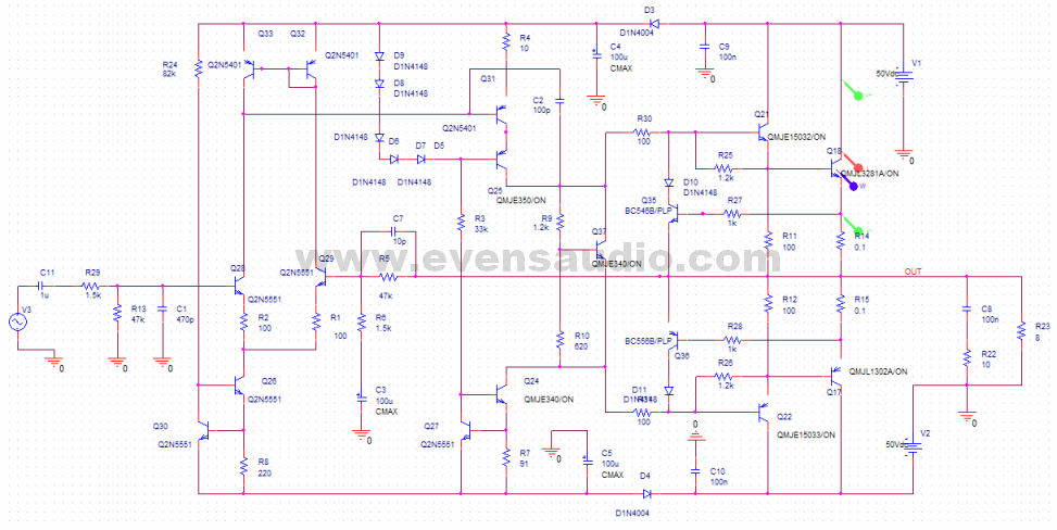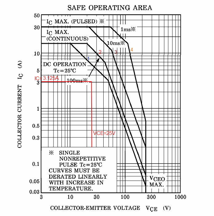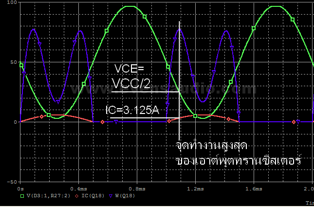 รูปที่ 3 เราจะวิเคราะห์จากค่าแรงดัน และกระแสที่ไหลผ่านเอาต์พุตทรานซิสเตอร์ โดยการซิมมูเลชั่นด้วยโปรแกรม OrCad เพื่อสังเกตดูว่า จะมีกำลังงานที่ตกคร่อมทรานซิสเตอร์สูงสุด ณ.จุดใด ให้ถือว่าจุดนั้นถือเป็นจุดทำงานสูงสุดของเอาต์พุตทรานซิสเตอร์ จากการสังเกต พบว่าจุดที่ค่าแรงดัน VCE มีค่าเท่ากับ VCC/2 จะมีกำลังงานตกคร่อมเอาต์พุตทรานซิสเตอร์สูงสุด เช่นในตัวอย่างนี้วงจรมีแหล่งจ่ายไฟ +/-50Vdc ในขณะที่ VCE= 25V จะทำให้กำลังงานตกคร่อมตัวเอาต์พุตสูงที่สุดในขณะที่โหลดมีค่า 8 โอห์ม จะมีกระแสไหลได้สูงสุด คำนวณได้โดยกฎของโอห์ม I=E/R แทนค่าในสมการจะได้ 25/8 = 3.125A เราจะนำแรงดัน 25V และ กระแส 3.125A นี้มาพอร์ทในกราฟพื้นที่ปลอดภัยจาก Datasheet ในแกน X,Y ของ VCE และ IC จะเห็นได้ว่า เส้นกระแส IC และแรงดัน VCE ตัดกันภายในบริเวณพื้นที่ปลอดภัย ดังรูปที่ 4 เพียงเท่านี้เราก็สามารถมั่นใจได้เลยว่า เมื่อใช้เอาต์พุตทรานซิสเตอร์เพียง 1 คู่ ตามวงจร เครื่องขยายจะไม่เสียหายจากการใช้งานที่โหลด 8 โอห์ม อย่างแน่นอน ยิ่งเส้นกระแส IC และแรงดัน VCE ตัดกันในตำแหน่งที่ไกลจากขอบเส้น DC Operation เท่าไหร่ ยิ่งมีความปลอดภัยสูงขึ้นเท่านั้น