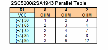 แถมท้ายด้วยตารางสำหรับเป็นแนวทางการขนานทรานซิสเตอร์ยอดนิยม เบอร์ 2SC5200 และ 2SA1943 สำหรับทรานซิสเตอร์เอาต์พุตเบอร์อื่นก็สามารถใช้วิธีการเดียวกัน โดยอ้างอิงกราฟ SOA จาก Datasheet ของเบอร์นั้นๆ สรุปการขนานเอาต์พุตทรานซิสเตอร์ยิ่งจำนวนมาก ยิ่งทำให้ภาคเอาต์พุตของเพาเวอร์แอมป์ปลอดภัยมากขึ้น แต่บทความนี้เป็นแนวทางที่จะนำเสนอวิธีการจัดการให้เหมาะสม เกิดความคุ้มค่าสูงสุด ยิ่งเป็นทรานซิสเตอร์เบอร์ที่มีราคาแพง การขนานเอาต์พุตทรานซิสเตอร์จำนวนมากๆ อาจเกินความจำเป็น หวังว่าจะมีประโยชน์สำหรับผู้ที่สนใจไม่มากก็น้อย