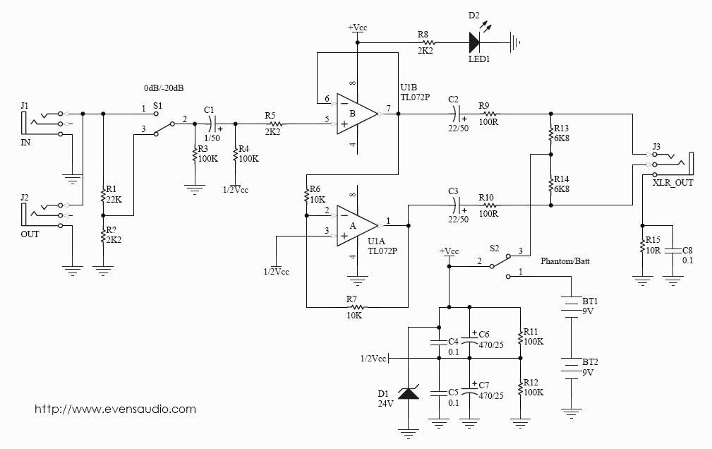 จากรูปที่ 1 เป็นวงจร Active Direct Box โดยใช้ออปแอมป์บอร์ TL072 สัญญาณจากเครื่องดนตรีจะผ่านเข้ามาทาง J1 และส่งสัญญาณโดยตรงออกไปยัง J2 เพื่อเชื่อมต่อกับตู้แอมป์ R1 และ R2 ต่อเป็นวงจรแบ่งแรงดันเพื่อลดทอนสัญญาณ กรณีที่สัญญาณอินพุตมีขนาดที่สูงมากเกินไป เช่นในอุปกรณ์ดนตรีที่มีเอาต์พุตแบบ Active สามารถปรับความไวของอินพุตได้ที่ S1สัญญาณจะถูกลดทอนลงไปที่ -20dB หากระดับสัญญาณไม่สูงมาก หรือเป็นอุปกรณ์ดนตรีประเภท Passive ก็สามารถใช้งานในตำแหน่ง 0dB ตามปกติได้ R3 ทำหน้าที่เป็นโหลดทางด้านอินพุตป้องกันสัญญาณรบกวนกรณีที่ไม่ได้เชื่อมต่ออุปกรณ์ดนตรีที่อินพุต C1 ทำหน้าที่เป็น Input Coupling ป้องกันแรงดันไฟตรงไหลย้อนจากวงจร R4 เป็นไบอัสให้ออปแอมป์มีเอาต์พุตเทียบเท่า 1/2Vcc ซึ่งจะทำให้การสวิงสัญาณได้สูงสุด R5 เป็นตัวต้านทานอินพุตของออปแอมป์ ซึ่งต่อเป็นวงจร Buffer มีอัตราการขาย 0dB หรือพูดง่าๆก็ไม่มีอัตราขยายเลย สัญาณเอาต์พุตจาก U1B จะถูกวงจรกลับเฟสสัญญาณโดย U1A ซึ่งประกอบด้วย R6 และ R7 กำหนดอัตราขยายไว้ที่ 0dB เช่นกันสัญญาณจากเอาต์พุตของออปแอมป์ทั้งสองมีเฟสที่ตรงกันข้ามกัน 180 องศา ส่งผ่าน C2 ,C3, R9 และ R10 ออกไปยังเอาต์พุต ซึ่งเป็นชนิด Balance วงจนี้ออกแบบให้สามารถเลือกใช้แหล่งจ่ายไฟได้ 2 ชนิด คือ แรงดันไฟเลี้ยงจาก แบตเตอรี่9 โวลต์ 2 ก้อน และ Phantom Power จากมิกซอร์ โดยการเลือกที่ S2 กรณีที่มิกเซอร์สามารถจ่ายแรงดัน Phantom Power ได้ กระแสจะไหลผ่าน R13 และ R14 และ D1 จะทำหน้าที่ Regulator ให้แรงดันเหลือเพียง 24Vdc และฟิลเตอร์ด้วยตัวเก็บประจุ C4,C5,C6 และ C7 ส่วน R11 และ R12 ทำหน้าที่แบ่งแรงดันเพื่อสร้างกราวด์เสมือนให้กับออปแอมป์ R5 และ C8 เป็นวงจร Ground Break ป้องกันการรบกวนที่อาจเกิดขึ้นจากกราวด์ลูป R8 และ D2 ต่อเป็นวงจรเพื่อแสดงผลการทำงานของเครื่อง