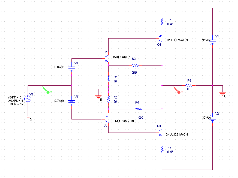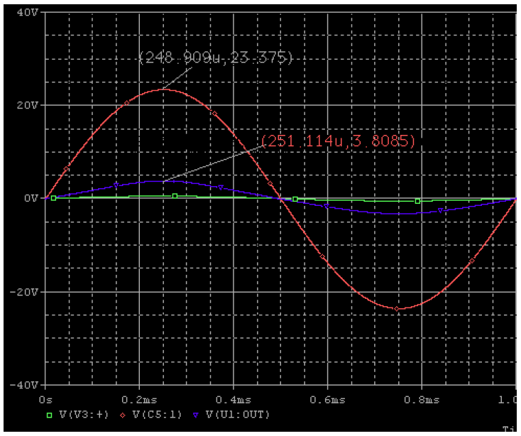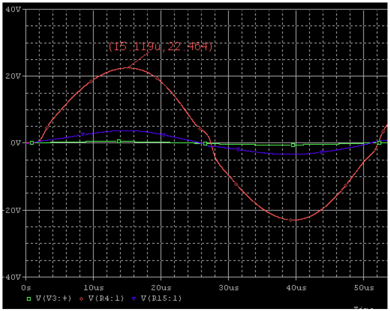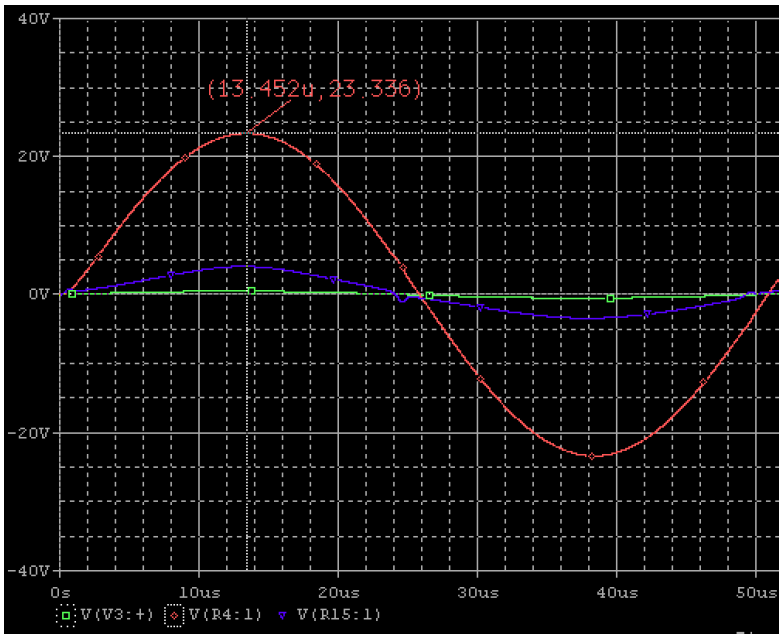 ผลจากการซิมมูเลชั่นวงจรในรูปที่6 โดยจ่ายสัญญาณไซน์ความถี่ 1kHz แรงดัน 0.5Vp จะทำให้ได้สัญญาณเอาต์พุตเส้นสีแดงสูงถึง 23.375Vp ดังรูปที่7 ซึ่งวงจรถูกกำหนดอัตราขยายไว้ที่ 47 เท่าโดยกำหนดจากค่า R12/R11 ก็คือ 47K/1K = 47 เท่านั่นเอง หรือคิดเป็นหน่วยเดซิเบลจะได้ค่าประมาณ 33dB นับว่ามีอัตราขยายสูงพอสมควรสำหรับวงจรขยายเสียงกำลัง 30 วัตต์ ส่วน C5 ค่า 18pF ที่ต่อคร่อมอยู่บนตัวต้านทาน 47K นั้นทำหน้าที่ลดอัตราขยายที่ความถี่สูงของวงจรป้องกันการออสซิลเลตที่ความถี่สูง จากรูปที่ 8 เมื่อใช้ความถี่ในการทดสอบเป็น 20kHz ทำให้มองเห็นความเพี้ยนของสัญญาณและการหน่วงของสัญญาณได้ชัดเจนมากกว่าเดิมสาเหตุมาจากค่า slew rate ของไอซีที่ต่ำทำให้การป้อนกลับแก้ไขชดเชยความเพี้ยนของสัญญาณไม่ทัน เมื่อทดลองเปลี่ยนออป-แอมป์เป็นเบอร์ NE5534 พบว่าสัญญาณมีรูปร่างที่ดีขึ้นความเพี้ยนน้อยลงและกำลังเอาต์พุตเพิ่มขึ้นอย่างเห็นได้ชัดดังรูปที่9 แต่เท่าที่ทราบปัญหาเรื่องการเปลี่ยนไอซีออป-แอมป์ยังคงมีให้พบเห็นได้บ่อย ส่วนหนึ่งมาจากวงจรเดิมที่ใช้ไอซี ออป-แอมป์ 741 นั้นจะกินกระแสต่ำกว่าออป-แอมป์คุณภาพสูงเบอร์อื่นๆหลายเบอร์ทำให้เมื่อเสียบออป-แอมป์ตัวใหม่เข้าไปทำให้วงจรกลับทำงานผิดพลาดดังนั้นควรศึกษาข้อมูลจาก Datasheet ว่าออป-แอมป์ที่จะนำมาแทน 741 นั้นกินกระแสเท่าไหร่แล้วจัดวงจรแหล่งจ่ายไฟ +/-15Vdc ในที่นี้คือการเพิ่ม-ลดค่า R13,R14 ให้สามารถจ่ายกระแสได้อย่างเพียงพอต่อออป-แอมป์เบอร์นั้นๆ