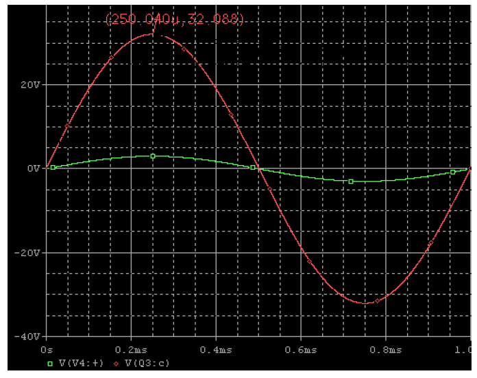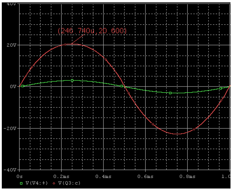จากรูปที่ 4 รูปสัญญาณเมื่อจ่ายแรงดันอินพุตเป็นสัญญาณไซน์ความถี่ 1kHz แรงดัน 3Vp กรณีที่ไม่มีโหลดวงจรจะสามารถขยายสัญญาณได้สูงสุดตามต้องการ คือสามารถขยายสัญญาณได้ถึง 10 เท่า โดยมีแรงดันเอาต์พุตถึง 32Vp และรูปสัญญาณยังคงสมบูรณ์ดีไม่ผิดเพี้ยนเป็นไปตามที่คำนวณไว้