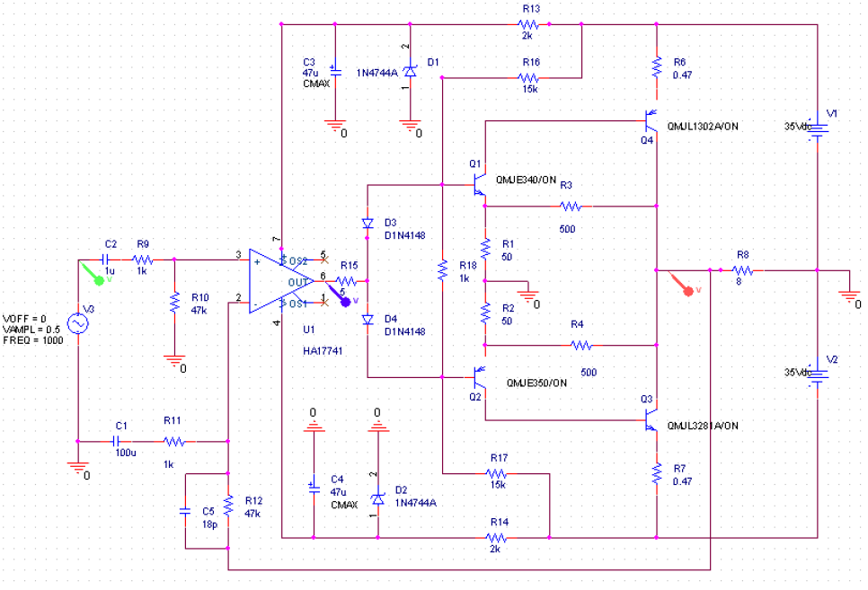 จากรูปที่2 เป็น Nomo graph แสดงค่า slew rate มีความสัมพันธ์กับแรงดันเอาต์พุตและความถี่สูงสุดจะเห็นได้ว่าหากต้องการขยายสัญญาณความถี่สูงและแรงดันเอาต์พุตสูงวงจรขยายสัญญาณต้องมีค่า slew rate สูงตามไปด้วย จากกราฟในรูปที่2 หากกำหนดความถี่สูงสุดที่20kHz และค่า slew rate 0.5V/us ต้องหลีกเลี่ยงไม่ให้สัญญาณเอาต์พุตจากออป-แอมป์มีการสวิงสัญญาณเกิน 4Vp ดังนั้นหน้าที่การขยายแรงดันที่จะทำให้ได้กำลังสูงสุดตามต้องการจึงต้องพึ่งภาคขยายถัดมานั่นก็คือส่วนของภาคเอาต์พุตโดยภาคเอาต์พุตของวงจรเพาเวอร์แอมป์ 741 จะถูกออกแบบมาให้มีความสามารถในการขยายแรงดันได้ซึ่งเป็นวงจรแบบคอมม่อนอีมิเตอร์ วงจรดังรูปที่ 3 เป็นวงจรในส่วนของภาคเอาต์พุตโดยมีการจัดไบอัสไว้แบบคลาส AB ซึ่งจะเห็นว่ามี V3, V4 เป็นแบตเตอรี่ซึ่งกำหนดแรงดันไว้ประมาณ VBE ของทรานซิสเตอร์ซึ่งในวงจรจริงจะใช้แรงดันตกคร่อมภายในไดโอด D3,D4 ทำงานร่วมกันกับ R16,R17,R18 ภาคเอาต์พุตที่มีอัตราขาย10 เท่า คำนวณจากค่า R3/R1 นั่นก็คือ 500/50 = 10 เท่า ซึ่งหากต้องการออกแบบเพาเวอร์แอมป์กำลังเอาต์พุต 30วัตต์ ที่โหลด 8 โอห์มวงจรจะต้องขยายแรงดันให้ตกคร่อมลำโพงไม่น้อยกว่า 16Vrms หรือประมาณ 22Vp หากคิดอัตราขยายของภาคเอาต์พุตไว้ที่ 10 เท่า จะต้องใช้สัญญาณเอาต์พุตจากออป-แอมป์ไม่น้อยกว่า 2.2Vp ซึ่งเอาต์พุตของออป-แอมป์ทั่วที่มีแหล่งจ่าย +/-15Vdc สามารถขับได้อยู่แล้วซึ่งดูแล้วเหมือนจะง่ายๆใช่ไหมครับ