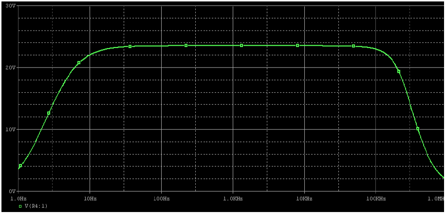 ผลการตอบสนองความถี่ของวงจรแสดงในรูปที่ 10 และ 11 จะสังเกตว่าเมื่อใช้ไอซี เบอร์HA17741 กราฟที่ได้จะไม่ราบเรียบส่วนที่โด่งขึ้นมาใยช่วงความถี่สูงคือความเพี้ยนฮาร์โมนิกความถี่สูงที่เกิดขึ้นตั้งแต่ความถี่ช่วง 10kHz เป็นต้นไปและสูงขึ้นเรื่อยๆซึ่งต้องปรับกระแสสงบให้มีค่าสูงขึ้นอีกความเพี้ยนจึงจะลดลงมาได้บ้างแต่ไม่สามารถทำให้หมดไปได้เพราะความเพี้ยนส่วนนี้ไม่สามารถนำไปป้อนกลับแก้ไขได้ทันเวลาเนื่องจากค่า Slew rate ของไอซีมีค่าต่ำเกินไปมีอีกวิธีที่จะลดยอดกราฟที่โด่งขึ้นมาโดยการลดอัตราขยายความถี่สูงลงโดยการเพิ่มค่า C5 ค่า 18pF เป็น 30-47pF ในรูปที่ 11เมื่อเปลี่ยนออป-แอมป์เป็นเบอร์ NE5534 แล้วความเพี้ยนที่ปรากฏขึ้นมาจะหายไปได้กราฟการตอบสนองความถี่ที่ราบเรียบขึ้นพร้อมผลการตอบสนองความถี่สูงที่ทำได้กว้างขึ้นอีก